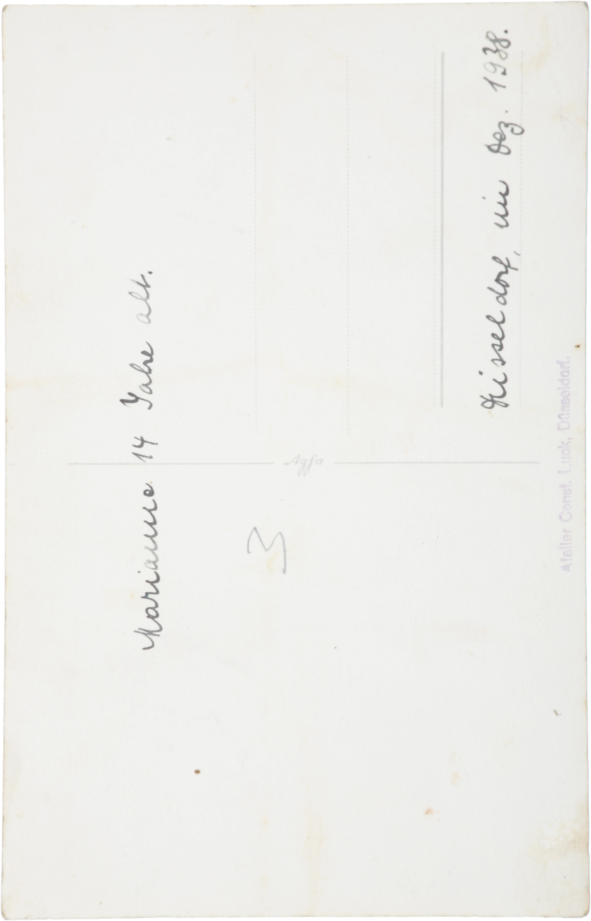 Auf der Rückseite befindet sich ein Adressbereich für den Versand, unterhalb davon der Stempel des "Atelier Const. Luck, Düsseldorf" sowie handschriftlich (Tinte) vermerkt: Marianne 14 Jahre alt. Düsseldorf, im Dez. 1938.